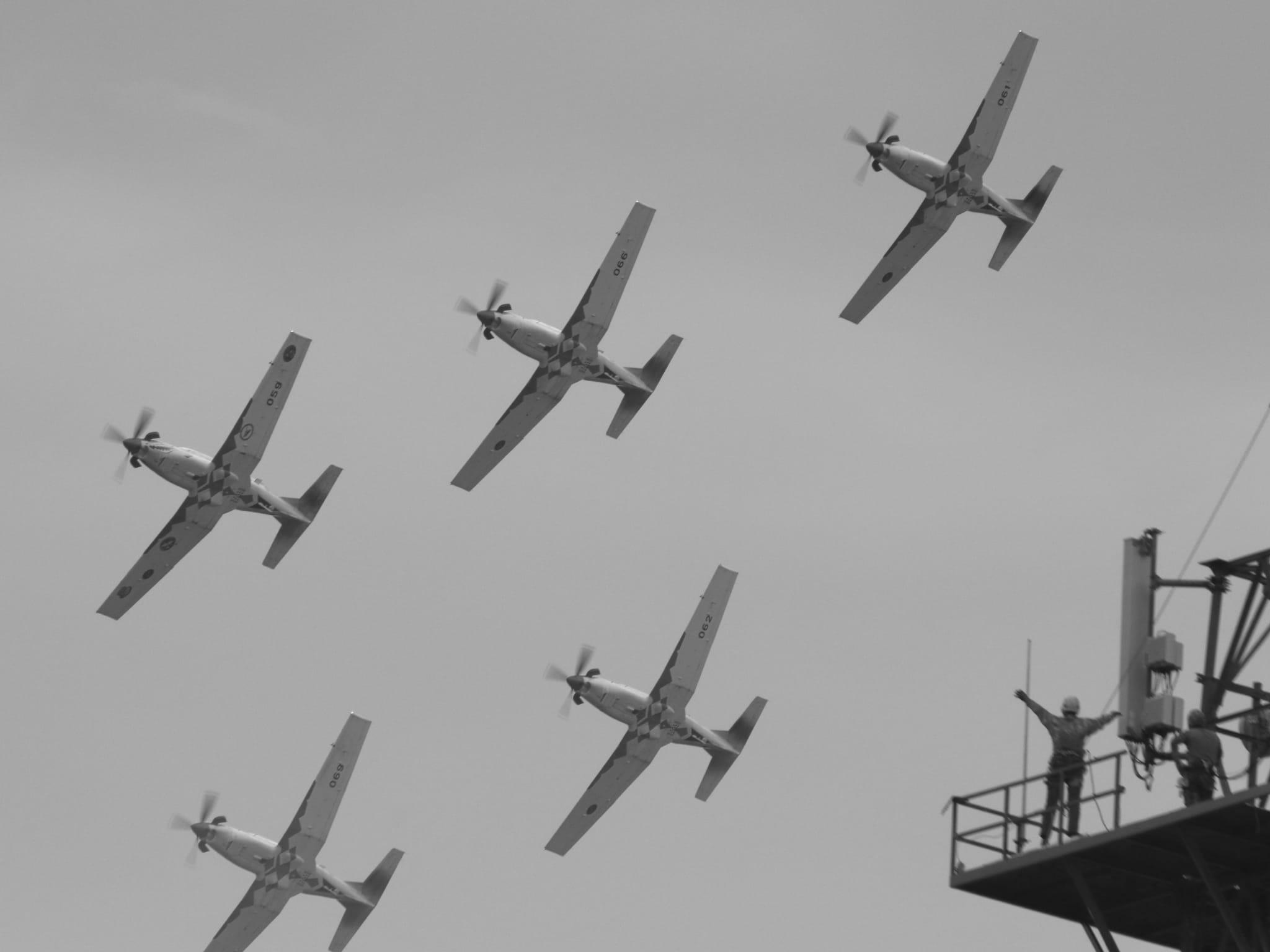 6. Obilježavanje 20. obljetnice akrobatskog tima „Krila Oluje“ iznad telekomunikacijskog tornja u Županji, zabilježeno u crno-bijeloj fotografiji profesionalnog fotografa, 2023.